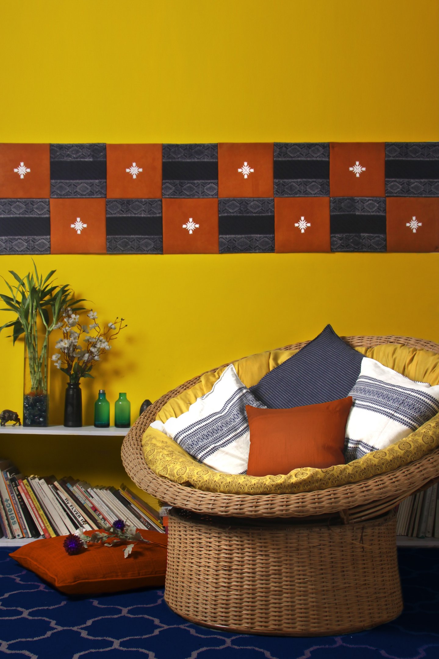 The deep blue rug with a geometric trellis pattern grounds the space, providing a cool counterbalance to the warm yellow and terracotta palette. An additional floor cushion in burnt orange reinforces the colour story while enhancing the relaxed, lounge-like atmosphere.