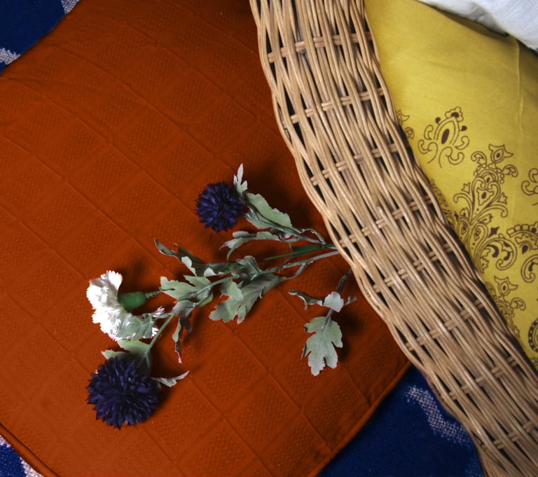 At the heart of the setting sits a sculptural wicker lounge chair with a rounded, cocoon-like form. Its natural woven texture softens the intensity of the wall colour, bringing warmth and an organic sensibility to the composition. Layered cushions — in ivory, charcoal, and rust tones — create visual contrast while enhancing comfort. The mix of patterns and solids adds dimension without overwhelming the eye.