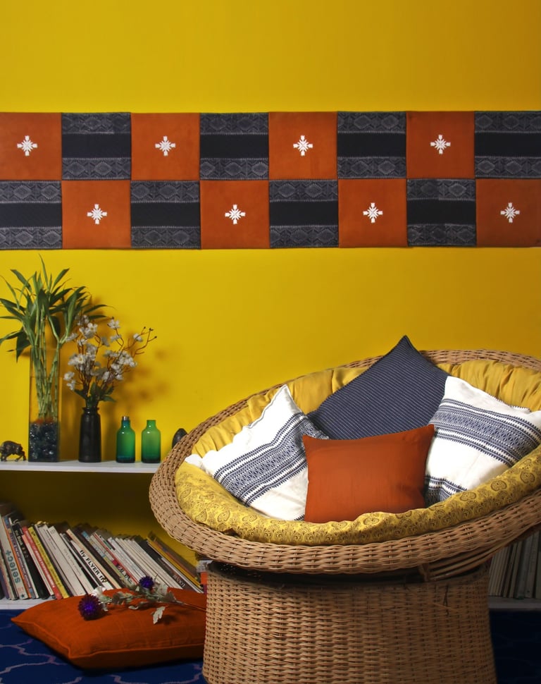 Against this vivid backdrop, a horizontal textile artwork introduces a rhythmic interplay of burnt orange and deep indigo panels, accented with delicate white motifs. The piece anchors the space, adding cultural depth and graphic balance.