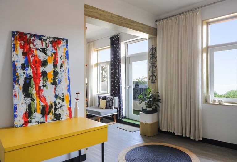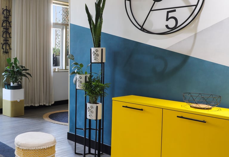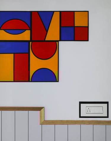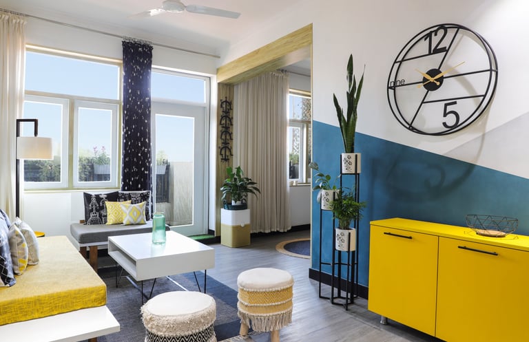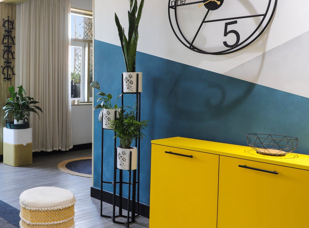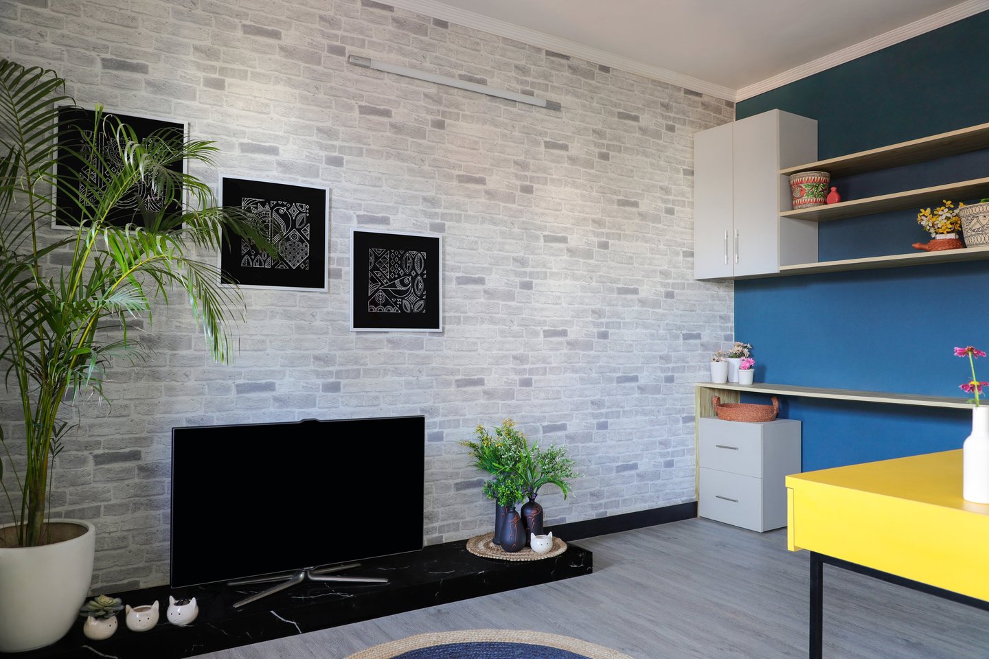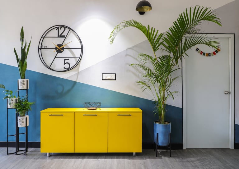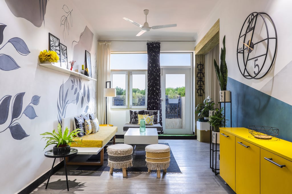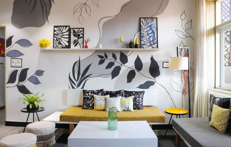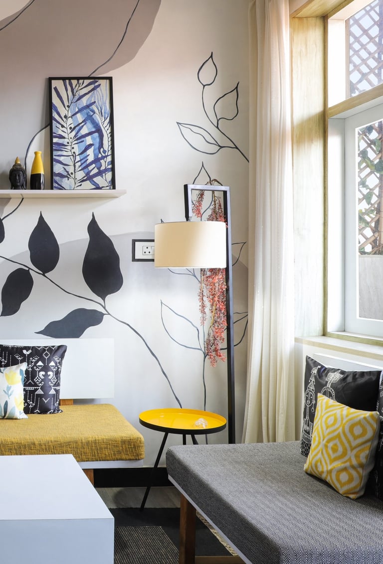 This beautifully designed home interior reflects a seamless blend of contemporary elegance and vibrant character. Bold artistic elements—such as striking murals, geometric and abstract artworks, and dynamic accent walls—create captivating focal points throughout the living spaces. Warm touches of mustard yellow, rich wood accents, and lush indoor plants balance the clean white, grey, and black palette, adding depth and personality to each room. The thoughtfully designed L-shaped kitchen and sleek bathroom showcase minimalist sophistication with crisp cabinetry, textured tiles, and refined fixtures, while the bedrooms offer serene retreats with calming tones, built-in storage, and subtle décor details. A stylish gallery passage, cosy seating nooks, and a functional study corner further enhance the home’s versatility. Bathed in abundant natural light, every space feels airy, inviting, and harmoniously connected in a modern yet warm living environment.