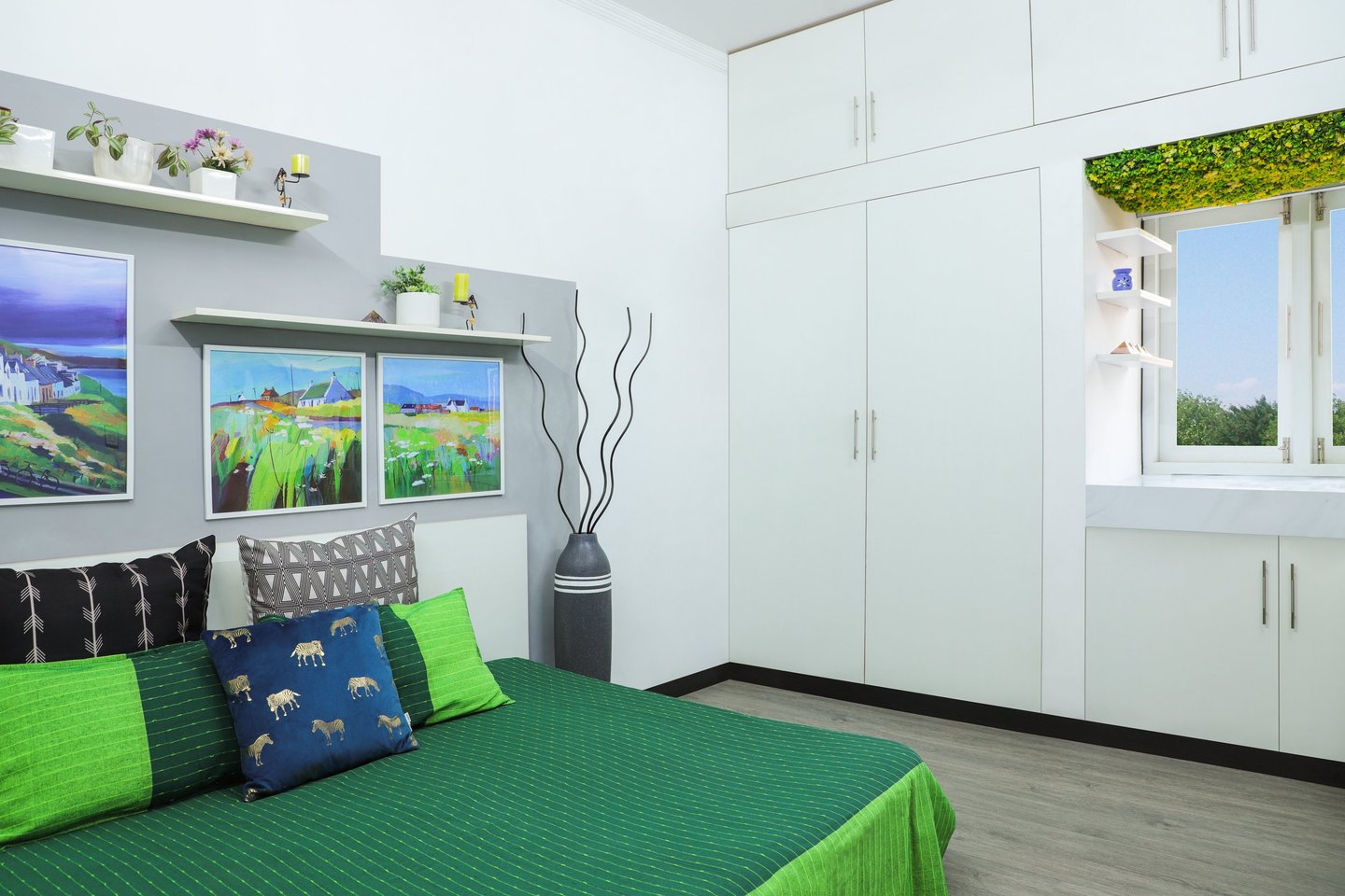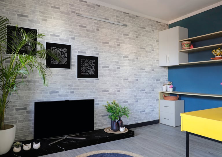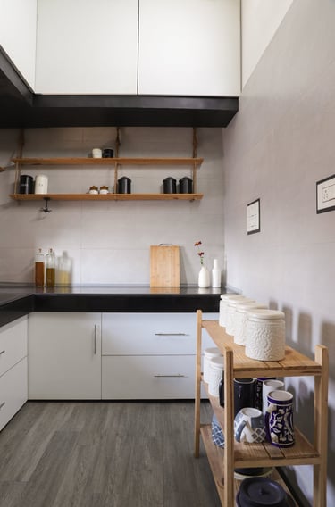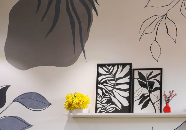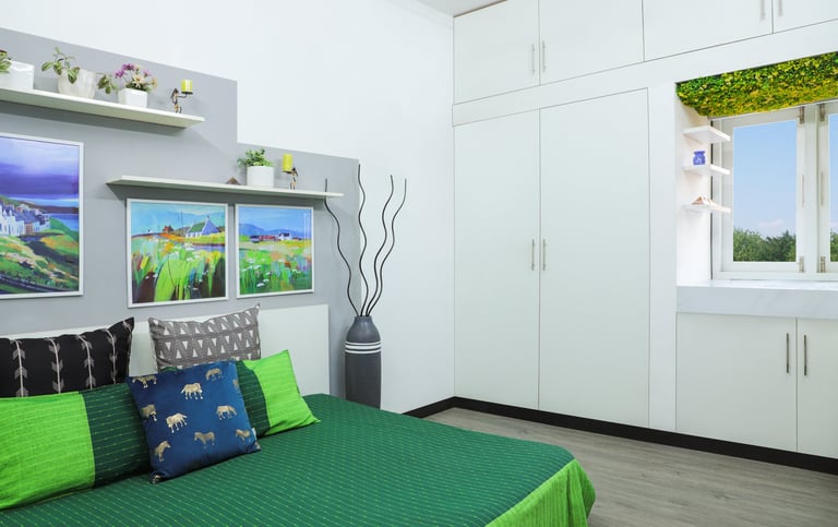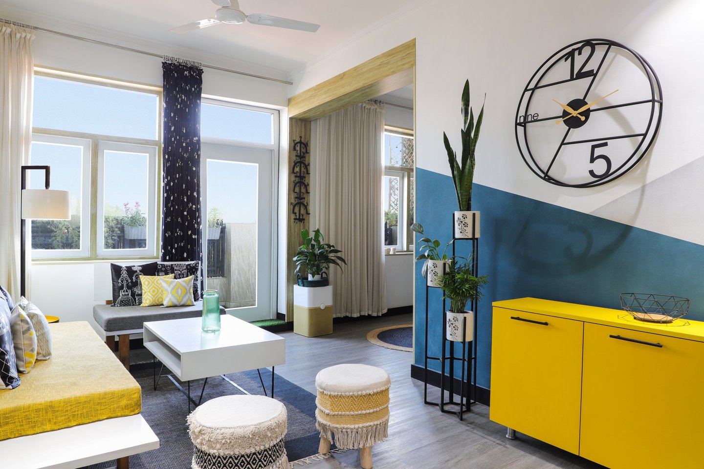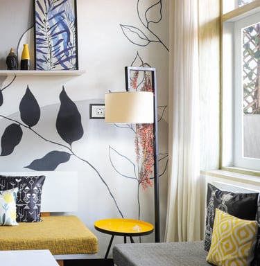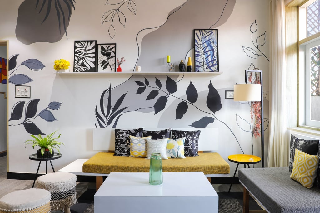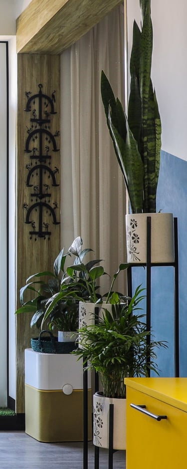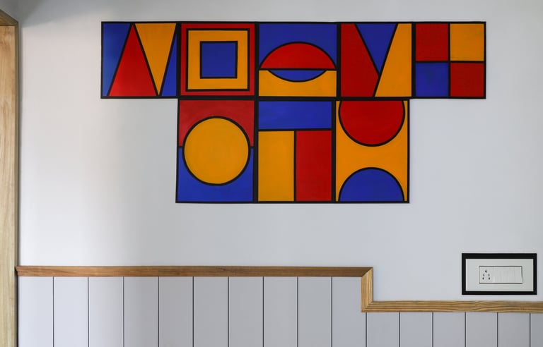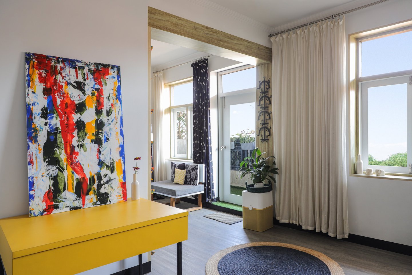 This beautifully designed home interior reflects a seamless blend of contemporary elegance and vibrant character. Bold artistic elements—such as striking murals, geometric and abstract artworks, and dynamic accent walls—create captivating focal points throughout the living spaces. Warm touches of mustard yellow, rich wood accents, and lush indoor plants balance the clean white, grey, and black palette, adding depth and personality to each room. The thoughtfully designed L-shaped kitchen and sleek bathroom showcase minimalist sophistication with crisp cabinetry, textured tiles, and refined fixtures, while the bedrooms offer serene retreats with calming tones, built-in storage, and subtle décor details. A stylish gallery passage, cosy seating nooks, and a functional study corner further enhance the home’s versatility. Bathed in abundant natural light, every space feels airy, inviting, and harmoniously connected in a modern yet warm living environment.