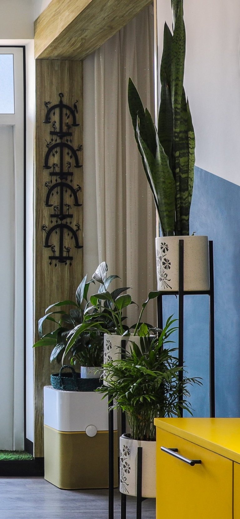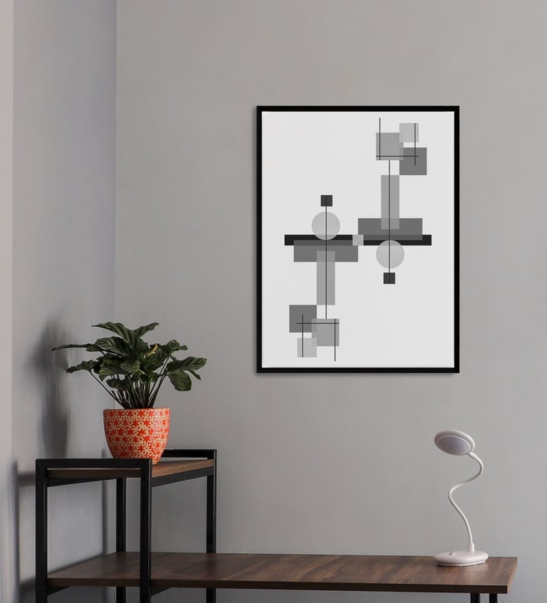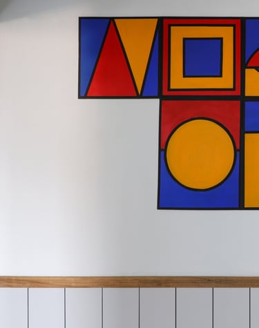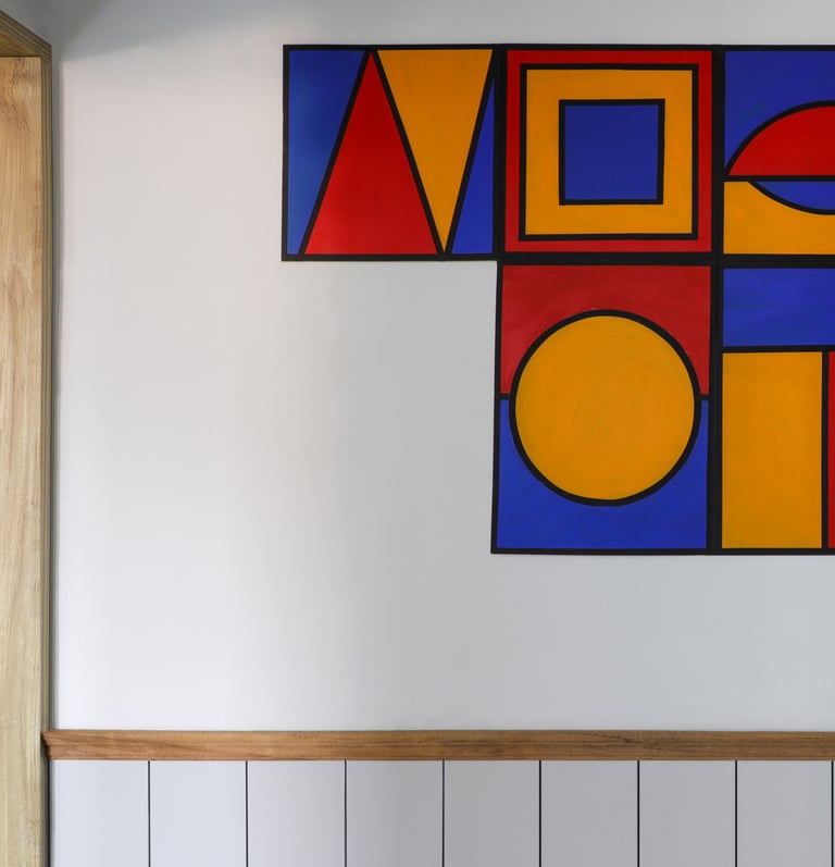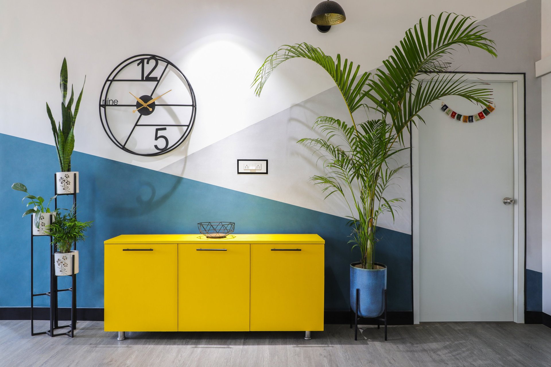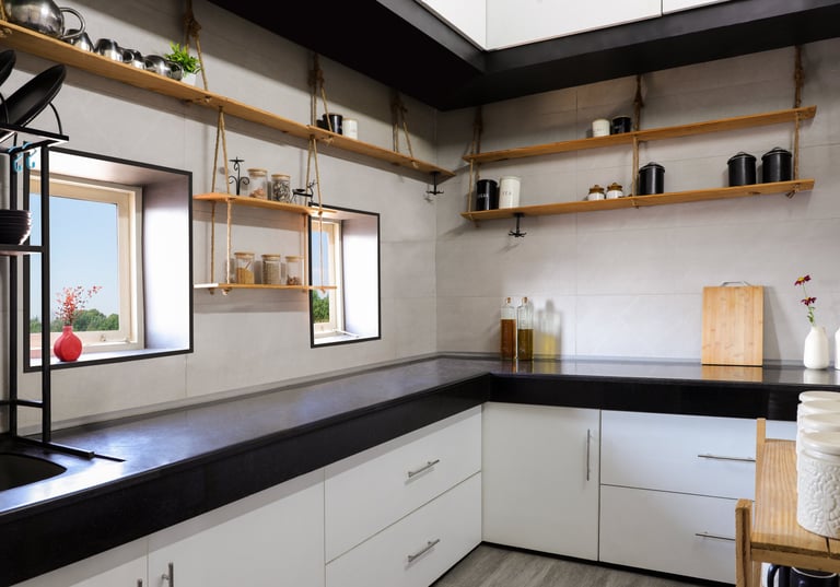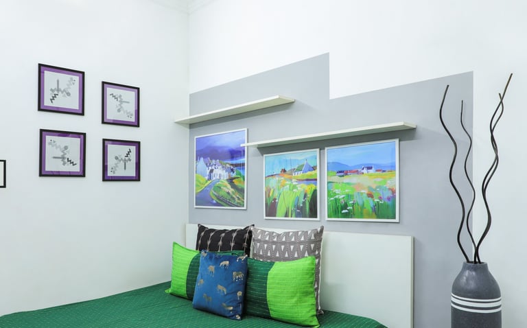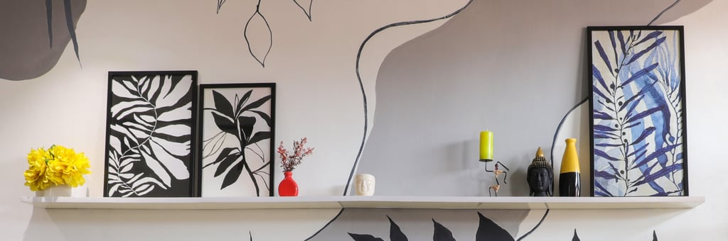 This beautifully designed home interior reflects a seamless blend of contemporary elegance and vibrant character. Bold artistic elements—such as striking murals, geometric and abstract artworks, and dynamic accent walls—create captivating focal points throughout the living spaces. Warm touches of mustard yellow, rich wood accents, and lush indoor plants balance the clean white, grey, and black palette, adding depth and personality to each room. The thoughtfully designed L-shaped kitchen and sleek bathroom showcase minimalist sophistication with crisp cabinetry, textured tiles, and refined fixtures, while the bedrooms offer serene retreats with calming tones, built-in storage, and subtle décor details. A stylish gallery passage, cosy seating nooks, and a functional study corner further enhance the home’s versatility. Bathed in abundant natural light, every space feels airy, inviting, and harmoniously connected in a modern yet warm living environment.